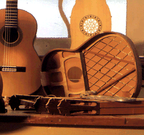 A Luciano Borges guitar (above) showing how the braces make the area above the bridge tighter than the area below to reduce phase cancellation and channel some of the energy into the second phase mode.
