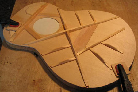 a small carbon string cittern guitar I make every part of the body, except for the moving sound board, as solid as possible to reduce any phase cancellation. I use the thickest wood I can bend (about 3mm) and I make the back braces full depth for the whole width and join them to the sides. The heavy wood around the soundboard acts as a tone ring does on a banjo. It isolates the the vibration in the sound board and helps to project the sound out of the instrument. The heavy side braces lock the back into the tone ring also increasing the projection. Designing the body to not vibrate is a principal of speaker box construction. While many makers now use lattice designs in their bracing, it is using carbon fiber above and below the braces that multiplies the overall strength of the lattice. The fibers lock the braces together in such a way that the energy moves freely between them. Below is my fan lattice design before fitting the top layer of carbon. I am using this bracing on my classical cittern guitars.