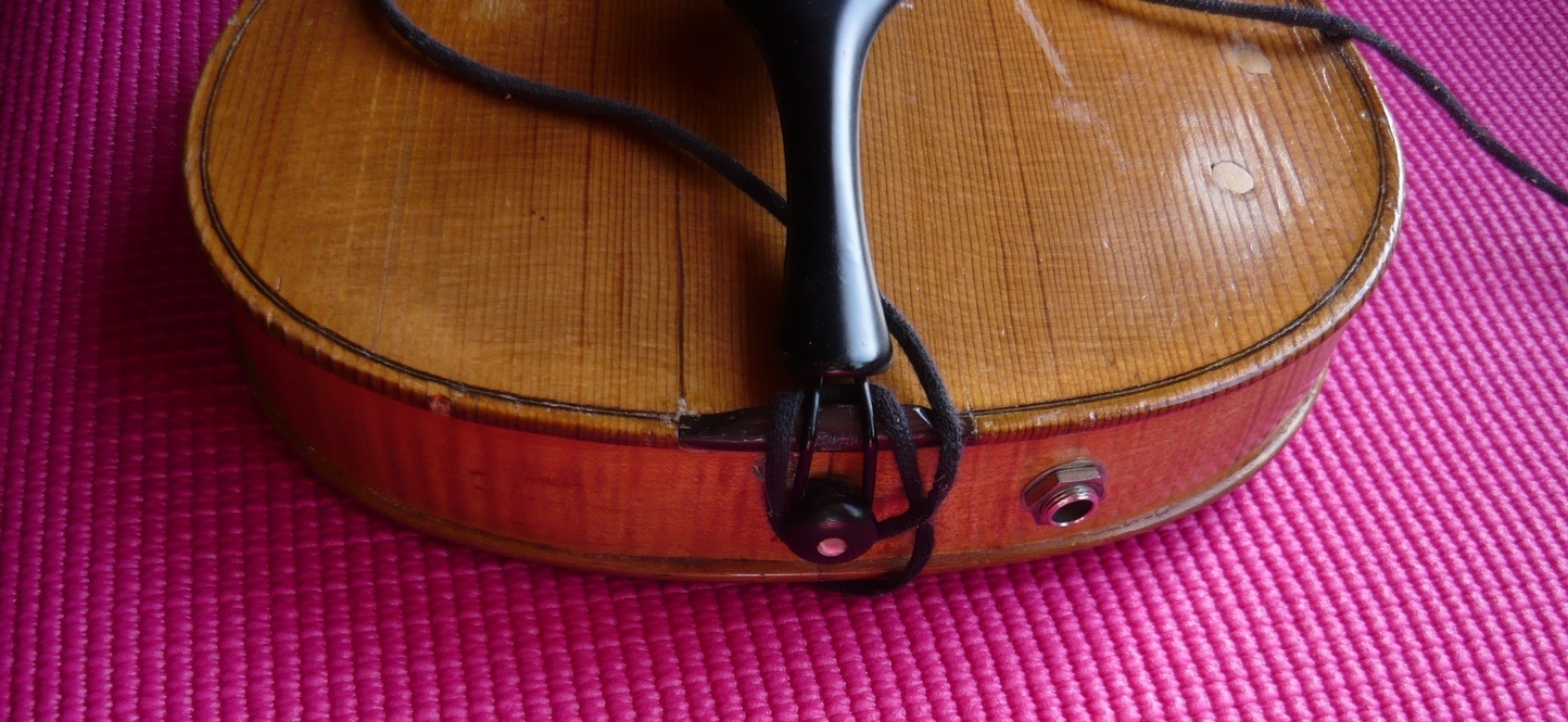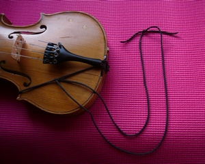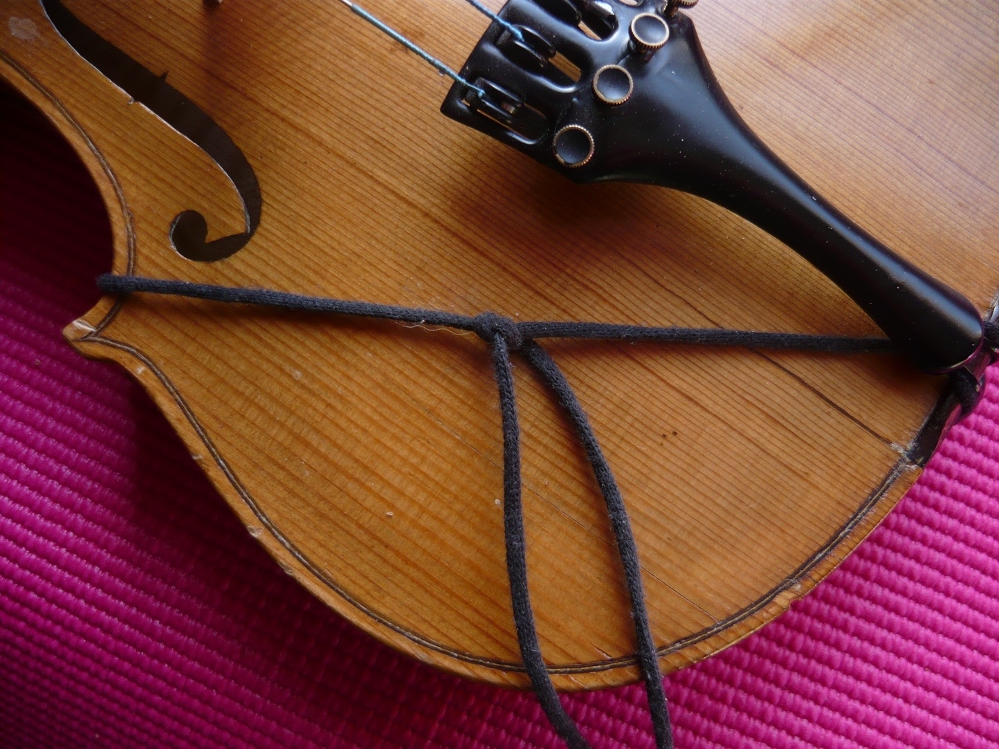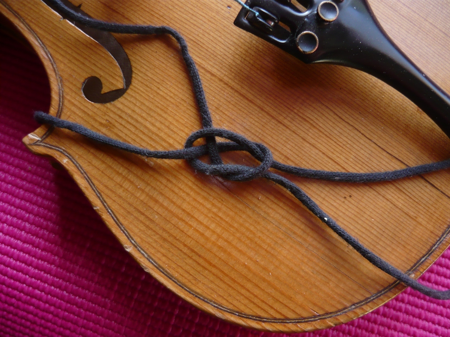 This is a violin harness made with a piece of string. I use one because after 30 years of playing violin on stage, I developed bad neck aches every time I played. I would recommend to any fiddler/violinist to have a go at this. Not only will it prevent shoulder and neck problems later on, but it helps developing a left hand technique that doesn't grip the neck. There is a commercial strap system available but I find it useless because it doesn't position the strap in the right spot. Click on pictures for enlargement