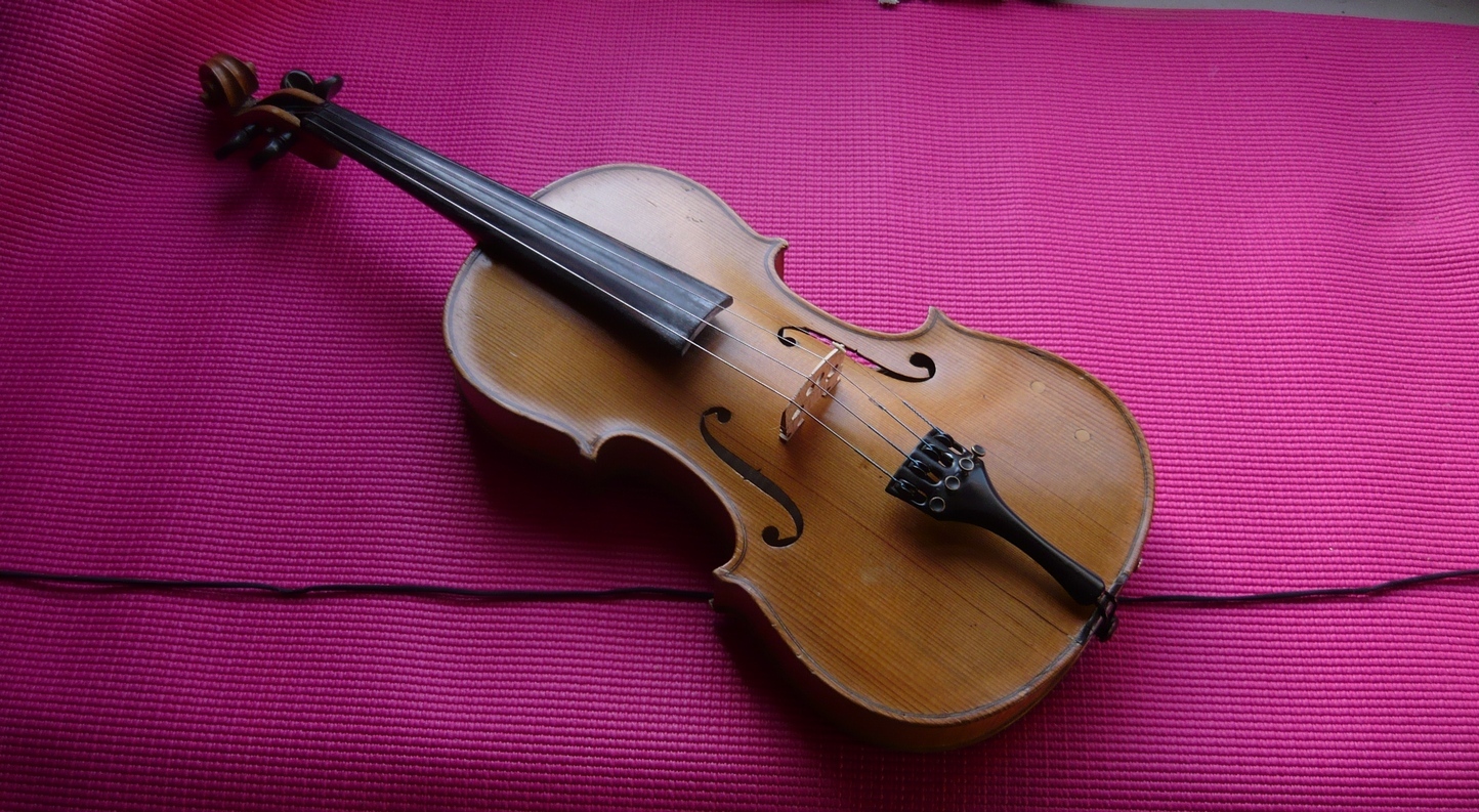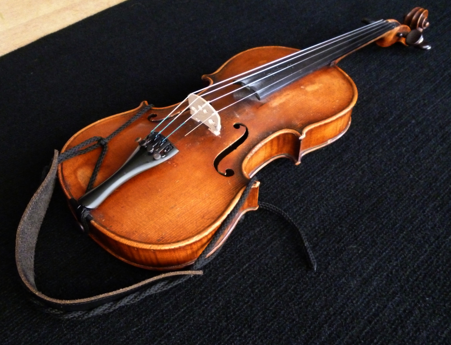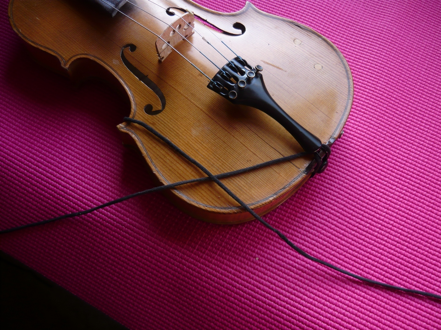 This is a violin harness made with a piece of string. I use one because after 30 years of playing violin on stage, I developed bad neck aches every time I played. I would recommend to any fiddler/violinist to have a go at this. Not only will it prevent shoulder and neck problems later on, but it helps developing a left hand technique that doesn't grip the neck. There is a commercial strap system available but I find it useless because it doesn't position the strap in the right spot. Click on pictures for enlargement